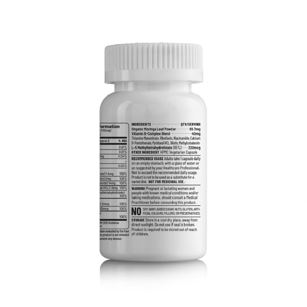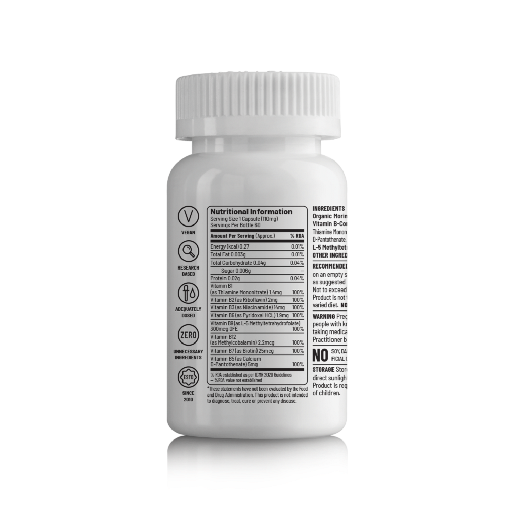 Unived Basics B-Complex has been formulated to offer you a complete RDA of all the essential B-vitamins to meet the daily requirement of B-vitamins. It contains the bioavailable form of B vitamins for better absorption and utilization of each vitamin. It also contains Organic Moringa Leaf powder for a complete package of goodness.