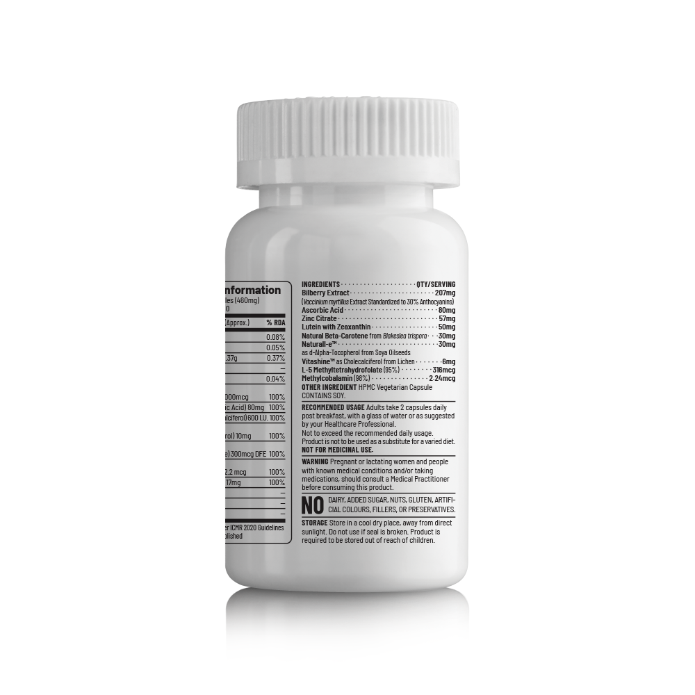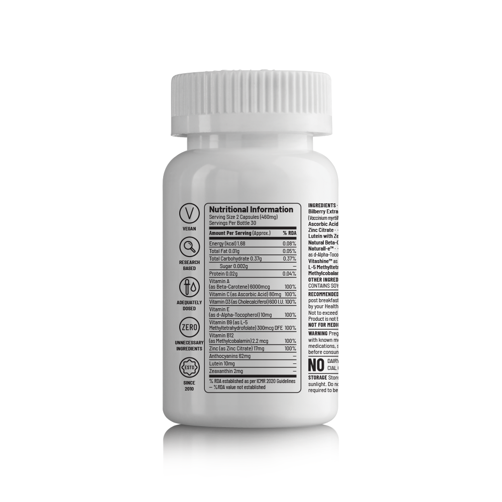 Carotenoids are made by plants and are found in various green leafy vegetables. In the body, Lutein and Zeaxanthin are found in the retina and lens where they act as natural antioxidants and help absorb damaging high-energy blue light and ultraviolet light. Beta-carotene is used to make vitamin A, which is required by the retina to detect light and convert it into electrical signals. Proanthocyanidins from Grape seed extract offers ocular health promotion. Other key vitamins and minerals ensure to prevent possible deficiencies and help to strengthen the immune system of the eye.
