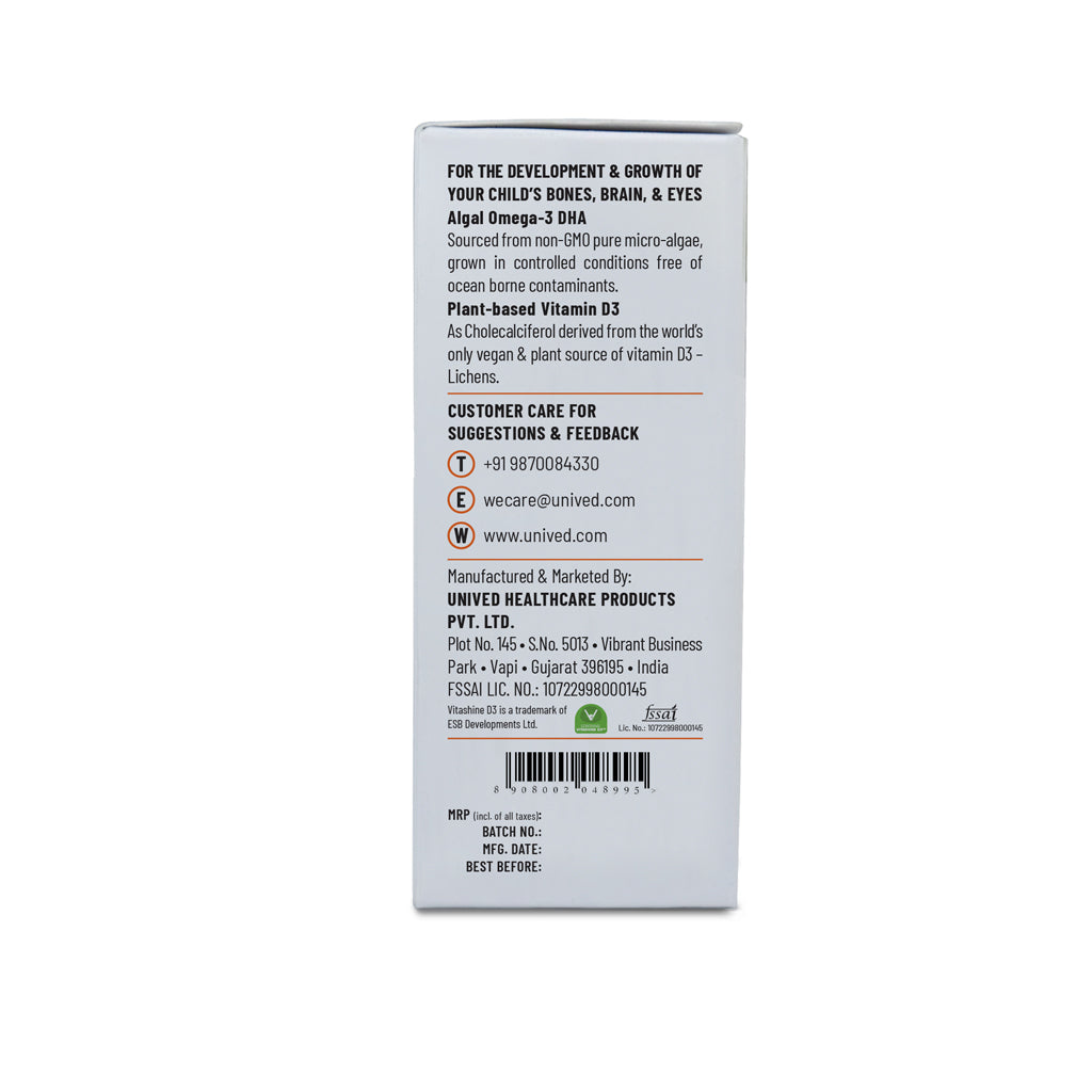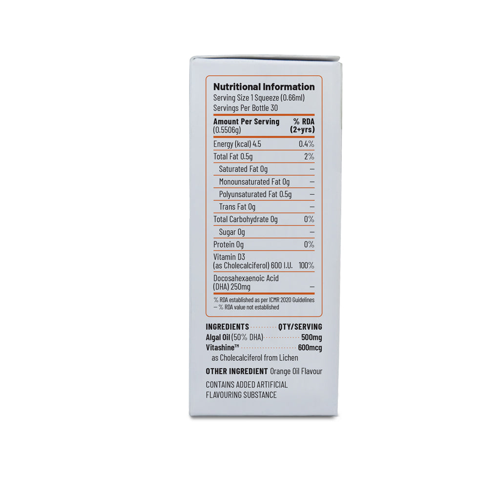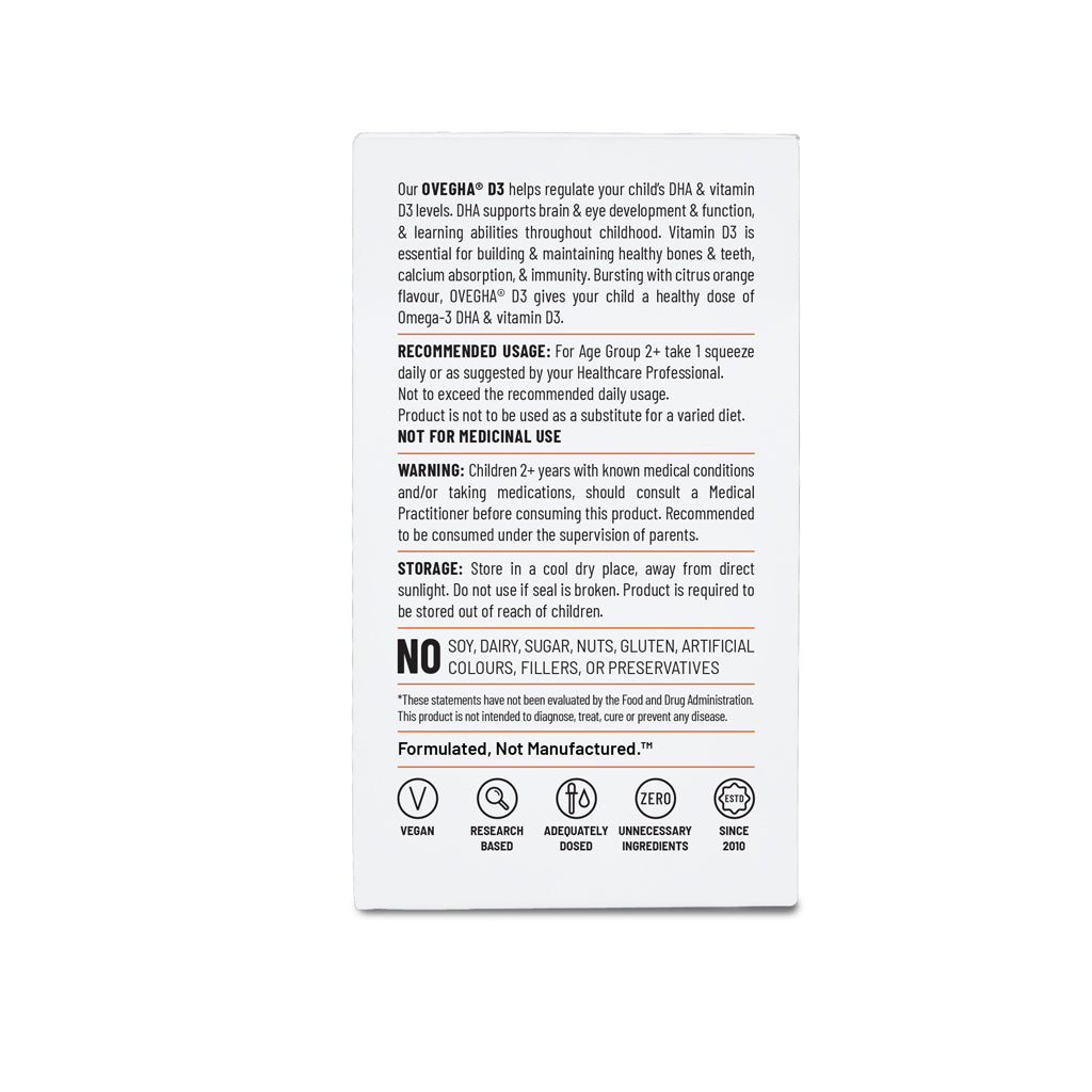 Ovegha D3 Kids is India’s only 100% Vegan, Plant-based Omega-3 DHA + Vitamin D3. Ovegha D3 Kids is formulated to support the development and functionality of the brain, eyes, heart, healthy bones, and immunity throughout childhood.